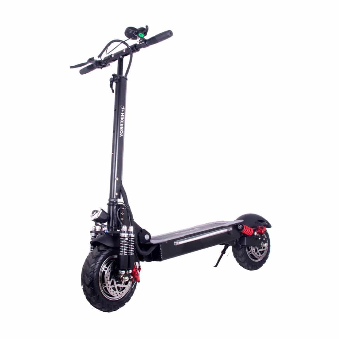 Avec la trottinette électrique hiker, nous sommes un peu sur une hors catégorie. C’est pourquoi, j’ai choisi de vous en parler en dernier. Il est question ici d’une trottinette électrique adulte tout terrain. En effet, elle est équipée de pas moins de 6 amortisseurs, répartis au nombre de 4 à l’avant et 2 à l’arrière. Vous avez aussi les pneus gonflables les plus larges, avec une dimension de 10 pouces. Evidemment le moteur Brushless va avec ce type de trottinette tout terrain. Il est question ici d’un puissance de 800 watts pour vous permettre de gravir des pentes de 30 degrés et d’atteindre les 40 km/h. Attention, il ne s’agit pas d’un modèle homologué route. Vous devrez donc l’utiliser sur des chemins et des voies privées pour profiter pleinement de toute ses capacités. Pour rappel, l’homologation route impose notamment d’avoir de série sur le modèle de la trottinette électrique, un siège et des rétroviseurs. La trottinette électrique Hiker a également besoin d’un moteur puissant car pour être en mode tout terrain, il faut qu’elle soit hyper stable pour des raison de sécurité. Il y a donc pas moins de 27 kg à propulser. L’avantage de ce poids certain est que vous pourrez embarquer jusqu’à un poids 125 kg sur la trottinette. Alors rassurez-vous, vous pourrez vous arrêter facilement puisque vous avez des freins à disque. Du point de vue de la batterie, elle est bien sûr en lithium et de 18Ah pour se montrer à la hauteur des 40 km d’autonomie. Par contre, comptez 10 heures pour une charge complète. Alors ne prévoyez pas une sortie à la dernière minute ou vous n’irez pas bien loin.